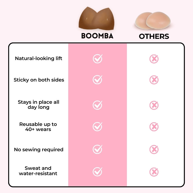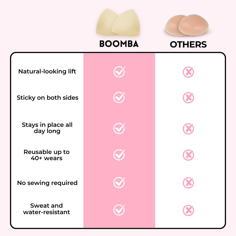 Unlike a sticky bra that is supported by the adhesive, BOOMBA inserts are supported by the clothing, they cannot stay up by themselves. It is crucial to wear them in tight, structured, and fitted tops.