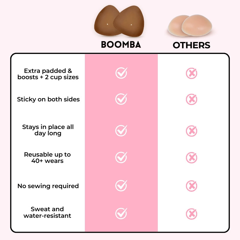 Unlike a sticky bra that is supported by the adhesive, BOOMBA inserts are supported by the clothing and cannot stay up by themselves. It is crucial to wear them in tight, structured, and fitted tops.