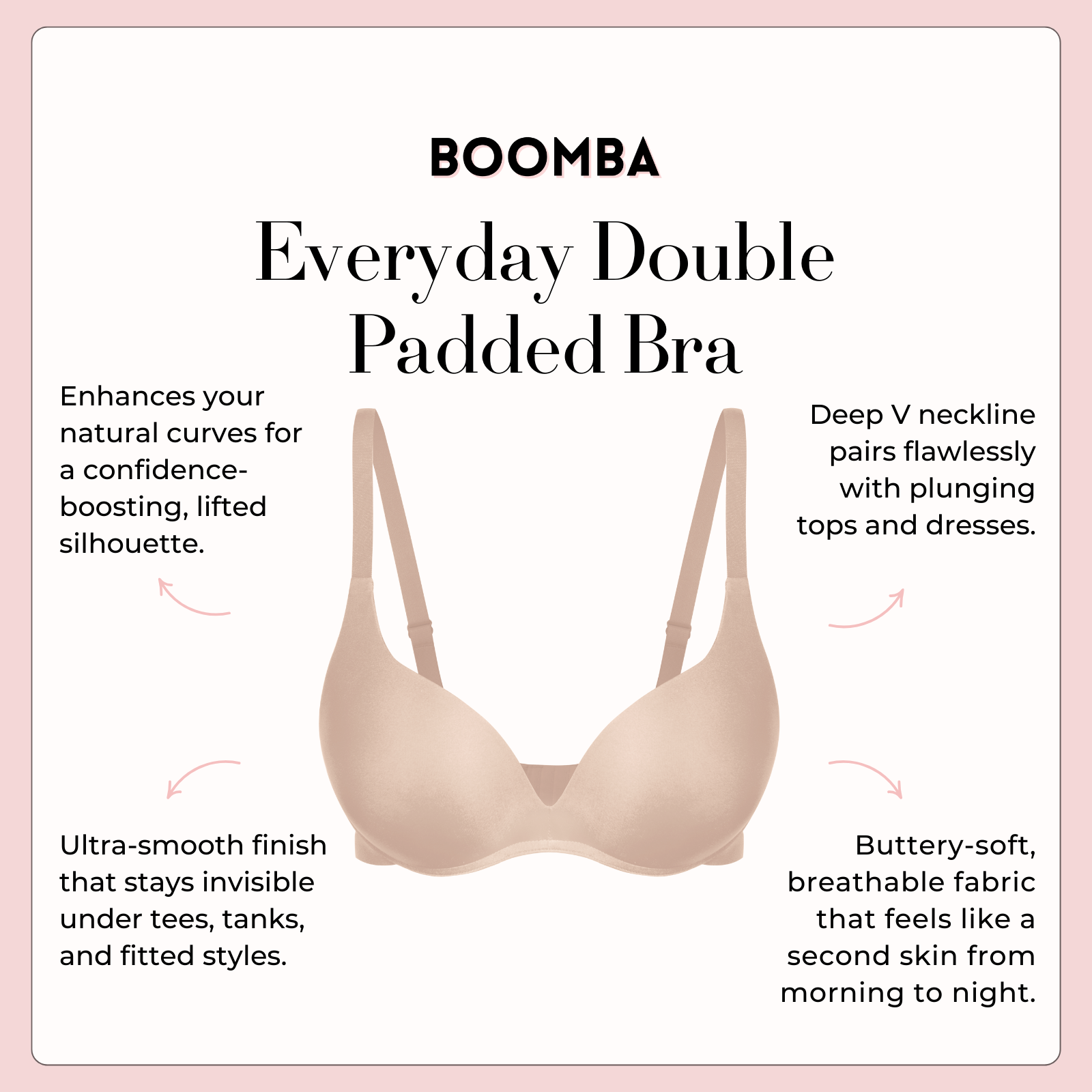 Meet the perfect push-up bra: The Everyday Double Push-Up Bra by BOOMBA. Designed to lift, shape, and enhance, this wireless double push-up bra delivers serious cleavage and support without sacrificing all-day comfort. With a deep plunge neckline that works perfectly under V-necks and low-cut tops, this is the bra that gives you the cleavage you have always dreamed of.