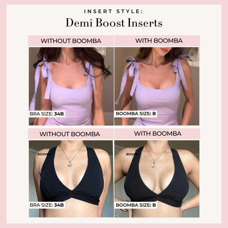 I have tried SOOOO many sticky bras and have hated all of them! I saw ads for these inserts and finally caved. I bought the Ultra Boost and Demi Boost. I wasn’t sure if they were going to work on me because I have very small boobs but these worked wonders! All of my low cut tops fit so much better now and the double sided stick is amazing. Do not walk, RUN to buy these!!!