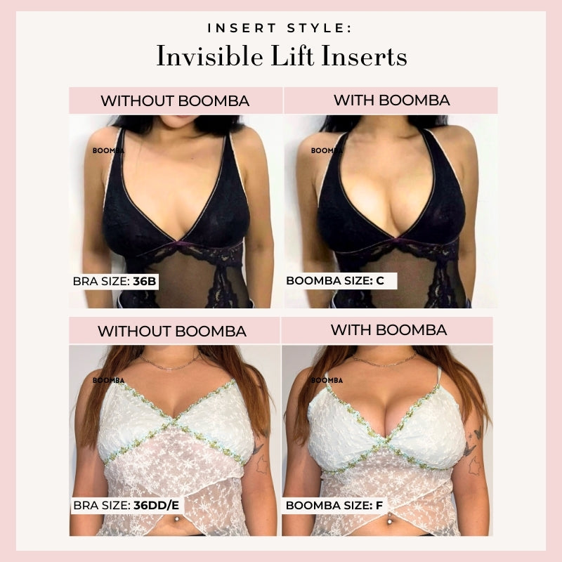 I used these for my wedding and it gave me the perfect amount of lift! I am a 36DD and these were perfect! They stayed in place all day and didn't notice they were there! Funny thing is that I put them on around 12 p.m and at 4 p.m. I looked down and realized I didn't take off the plastic part that goes against my chest, but it stayed perfectly in place even though it was really sweaty! I wore these until 2 a.m and they were still stuck to my dress and chest without moving after tearing up the dance floor all night! 10/10 worth the money! I am allergic to adhesive but these did not irritate my skin at all! The left is before the Boomba after having alterations done and the right is with the Ultra Lift Boomba insert!